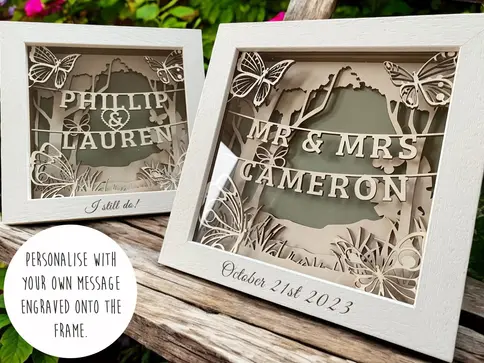This elegant shadow box frame (6 x 6in) creates an intricately cut and layered 3d scene featuring the couple's names or titles & surname. The frame itself can then feature a message or date to commemorate