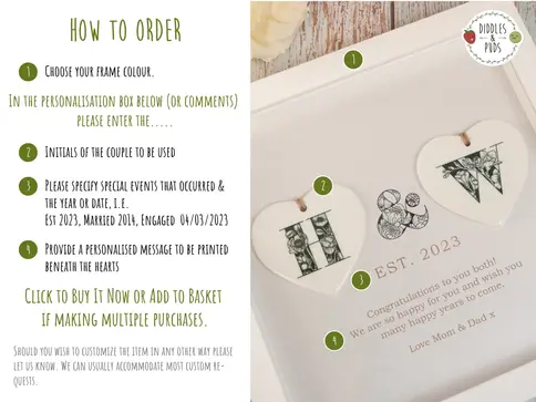 The recipient's initials & Year to be displayed, i.e. Est. 2014, Married 20