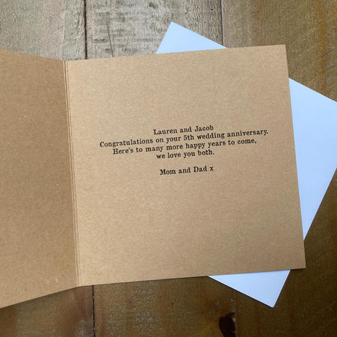 Celebrate love and milestones with our charming 5th anniversary card, thoughtfully designed to make your special occasion memorable. Crafted from high-quality kraft cardstock measuring 148 x 148mm, this unique greeting card features engraved wooden discs numbered one through five, symbolizing five beautiful years together.
