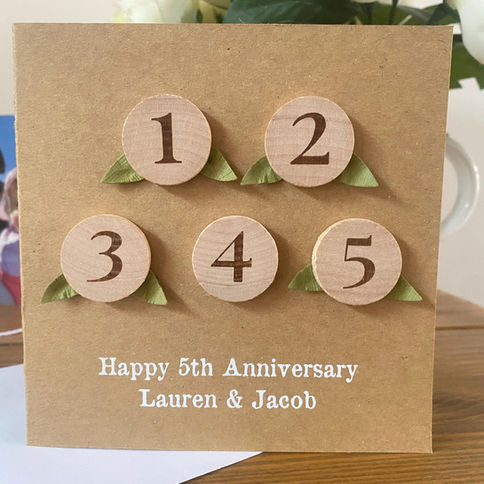 Personalized 5th Anniversary Card with Wooden Number Discs - Handcrafted Kraft